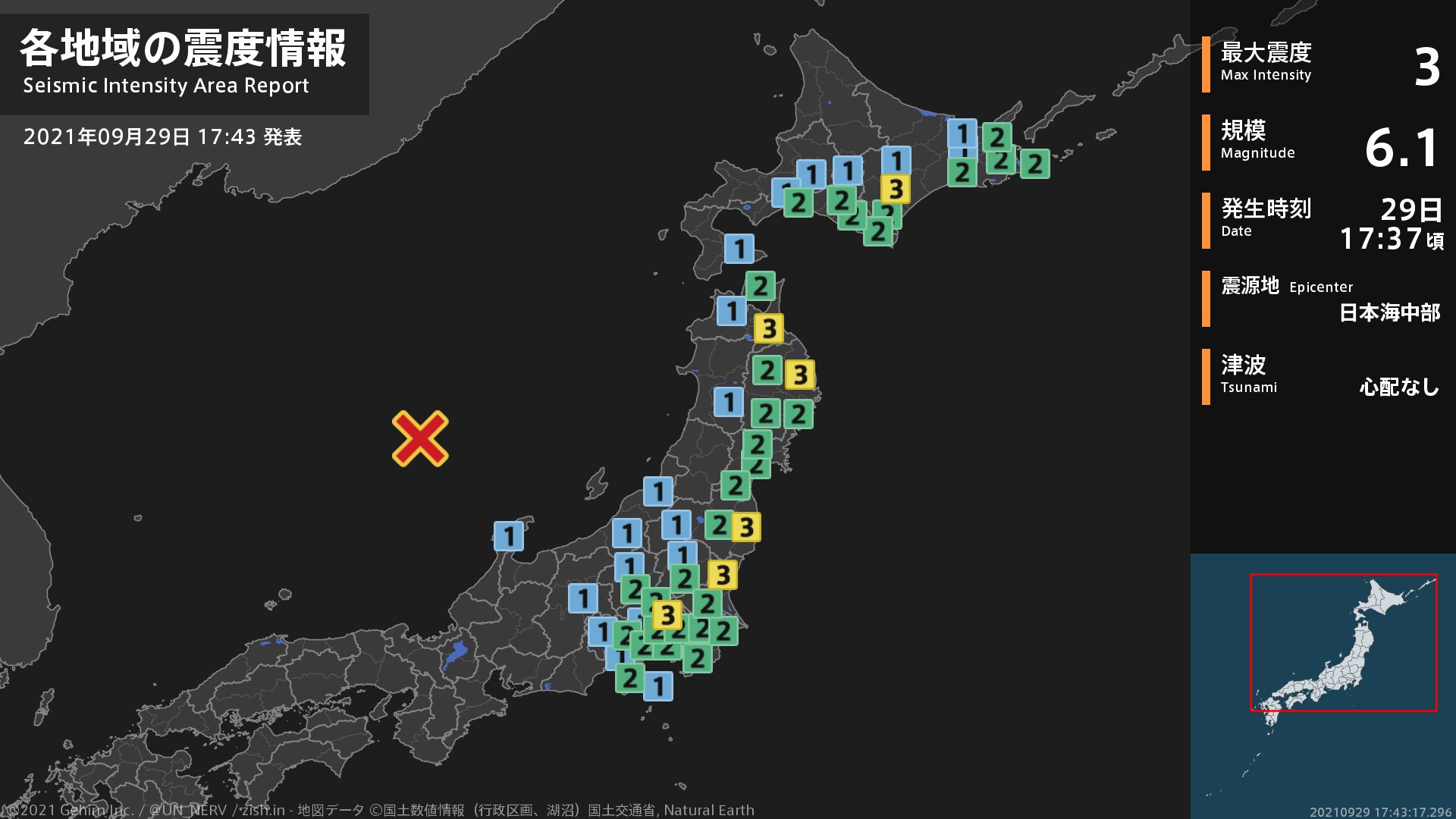 【地震情報 2021年9月29日】 17時37分頃、日本海中部を震源とする地震がありました。震源の深さは約400km、地震の規模はM6.1、最大震度3を北海道や埼玉県で観測しています。この地震による津波の心配はありません。